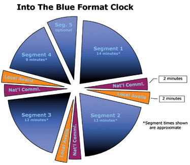 INTO THE BLUE® is provided on a full barter basis - without cost to commercial radio stations in the U.S. and ready for immediate download to authorized affiliates from our secure server in MP3 format. We reserve 6 minutes for national spots and provide you with 5 minutes for your local avails, plus an additional 5 minute segment which you can opt not to run in order to make room for news at the top of the hour (see format clock below). The show is 3 hours in length, and it's entirely your call whether to take 1, 2 or all 3. Each hour can easily work stand alone.